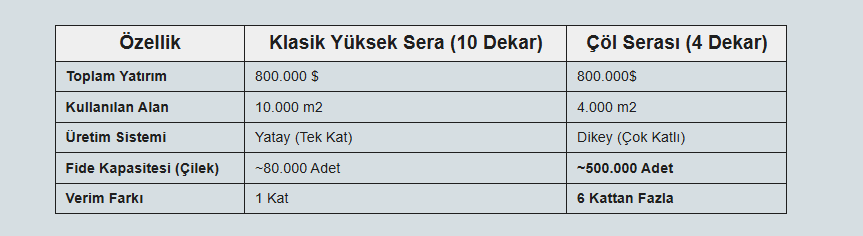 Klasik seralar sadece zemine yayılır; yani sadece alanı kullanır. Çöl Serası ise dikeydir; yani hacmi kullanır. Klasik serada ürün tek bir hat üzerinde yetişirken, Çöl Serası’nda katlar halinde üretim yapılır. Bu yüzden iki sistemi dekar başına maliyetle kıyaslamak, bir kamyon ile bir uçağı sadece "tekerlek sayısı" üzerinden kıyaslamaya benzer.